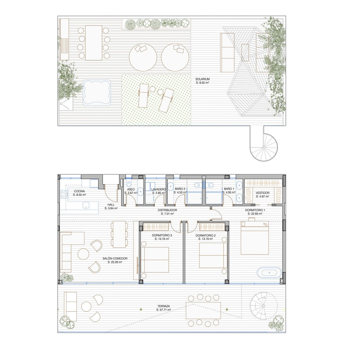 En la zona de noche: una suite principal con vestidor, baño privado y acceso directo a la terraza. Otras dos habitaciones, con armarios empotrados y también con acceso a la terraza, comparten un baño completo.