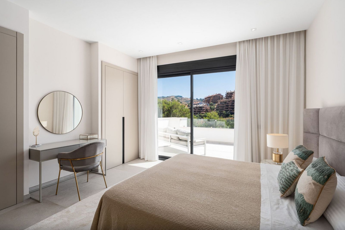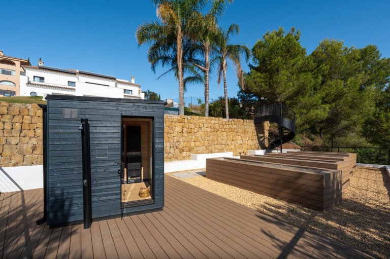Cada planta fluye sin esfuerzo hacia la siguiente, con terrazas amplias accesibles desde todas las habitaciones y áreas comunes. Los espacios exteriores incluyen una piscina cubierta, zona de barbacoa privada y una sauna, ideales para recibir invitados, disfrutar en familia o relajarse. Las vistas panorámicas al campo de golf de