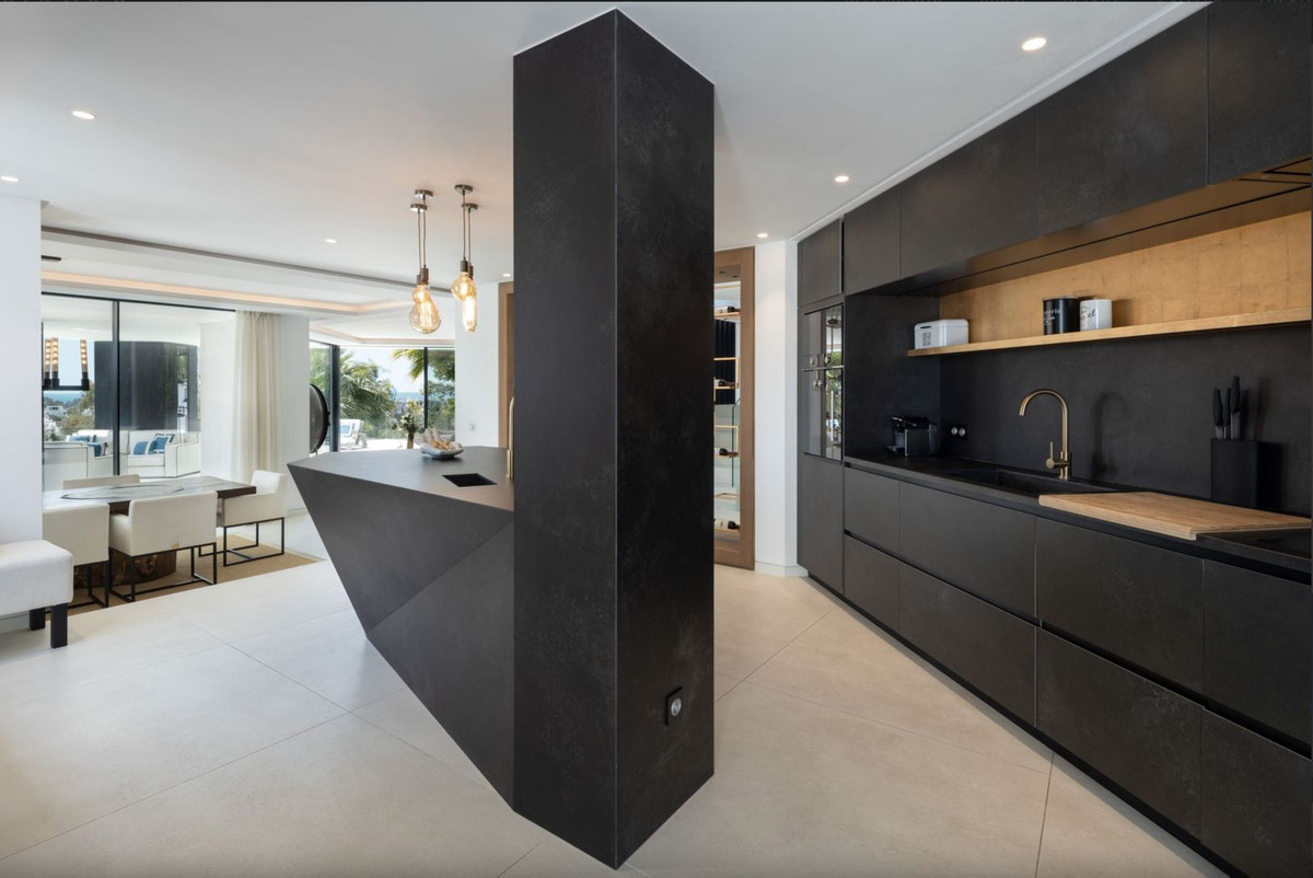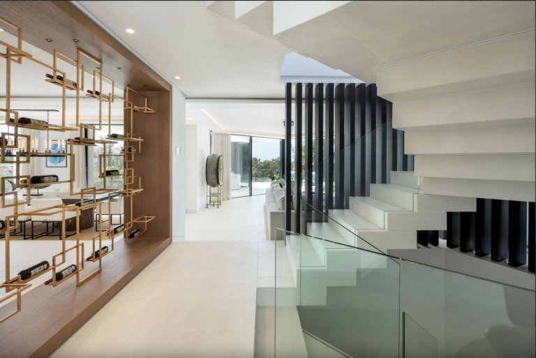 El interior dispone de cinco amplias suites y ocho baños, incluyendo seis baños en suite y dos aseos de cortesía. El mobiliario a medida de Omeo Design aporta una estética elegante y coherente en toda la vivienda. Las zonas de estar de concepto abierto destacan por su luminosidad y conexión fluida con el exterior, gracias a grandes ventanales con vistas abiertas al mar Mediterráneo.