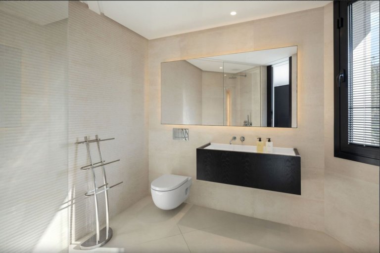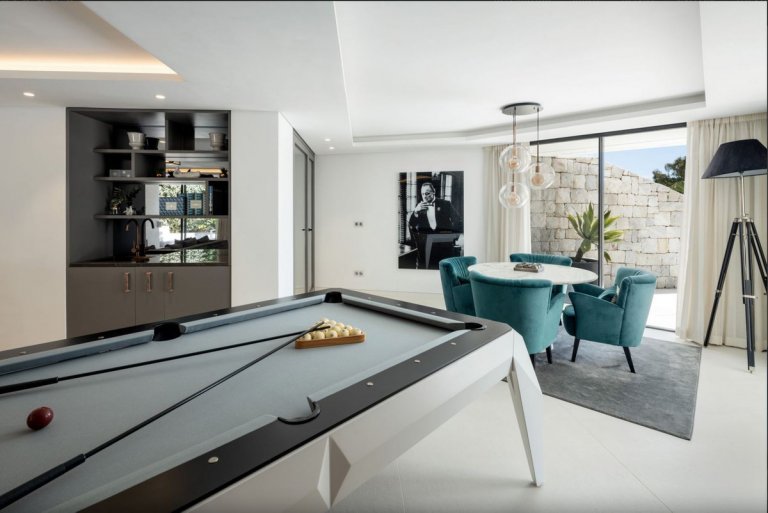 En la planta inferior se encuentran una sala de cine privada y una bodega de vino diseñada a medida, ideales para el ocio y el entretenimiento. En el exterior, las terrazas conducen a una piscina infinita de agua salada, un jacuzzi y una zona chill-out con chimenea exterior, todo ello rodeado de un jardín paisajístico con sistema de riego automático.
