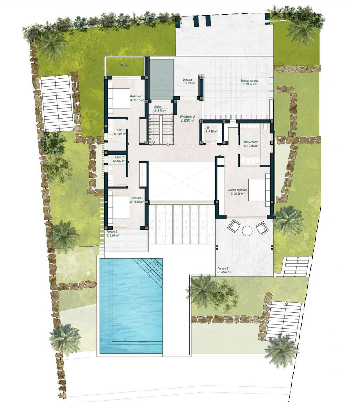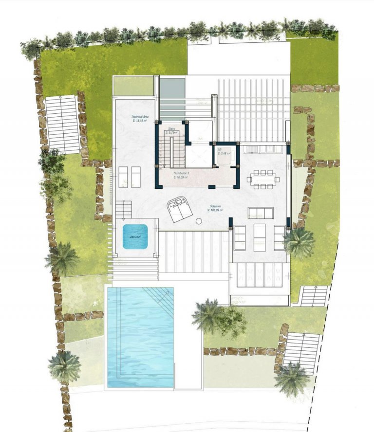 La villa est répartie sur 4 niveaux, comprenant un sous-sol et un solarium. Le rez-de-chaussée comprend le salon, la salle à manger et la cuisine ouverte. Au premier étage, vous trouverez 2 chambres avec leur propre salle de bain chacune, ainsi que la chambre principale avec une salle de bain attenante et une terrasse privée.