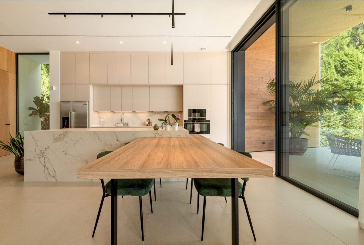 Le niveau principal offre une expérience de vie indoor-outdoor parfaite : un vaste salon ouvert sur la salle à manger se prolonge naturellement vers les terrasses ensoleillées et la piscine. Les baies vitrées toute hauteur baignent les espaces de lumière et créent une harmonie totale avec les espaces extérieurs. La cuisine design entièrement équipée, les plafonds double hauteur et la disposition intelligente en font une maison idéale, aussi bien pour les moments en famille que pour recevoir avec élégance.