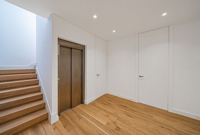 Le **sous-sol aménagé** propose un **garage pour trois voitures**, une **buanderie**, une **cuisine de service** et un **accès direct par ascenseur** à la cuisine principale. On y trouve également **trois chambres supplémentaires**, idéales pour accueillir les invités.