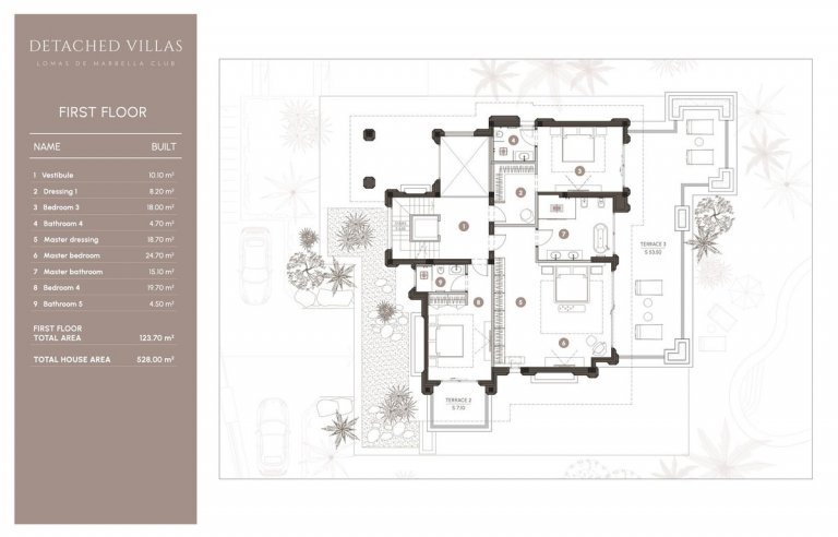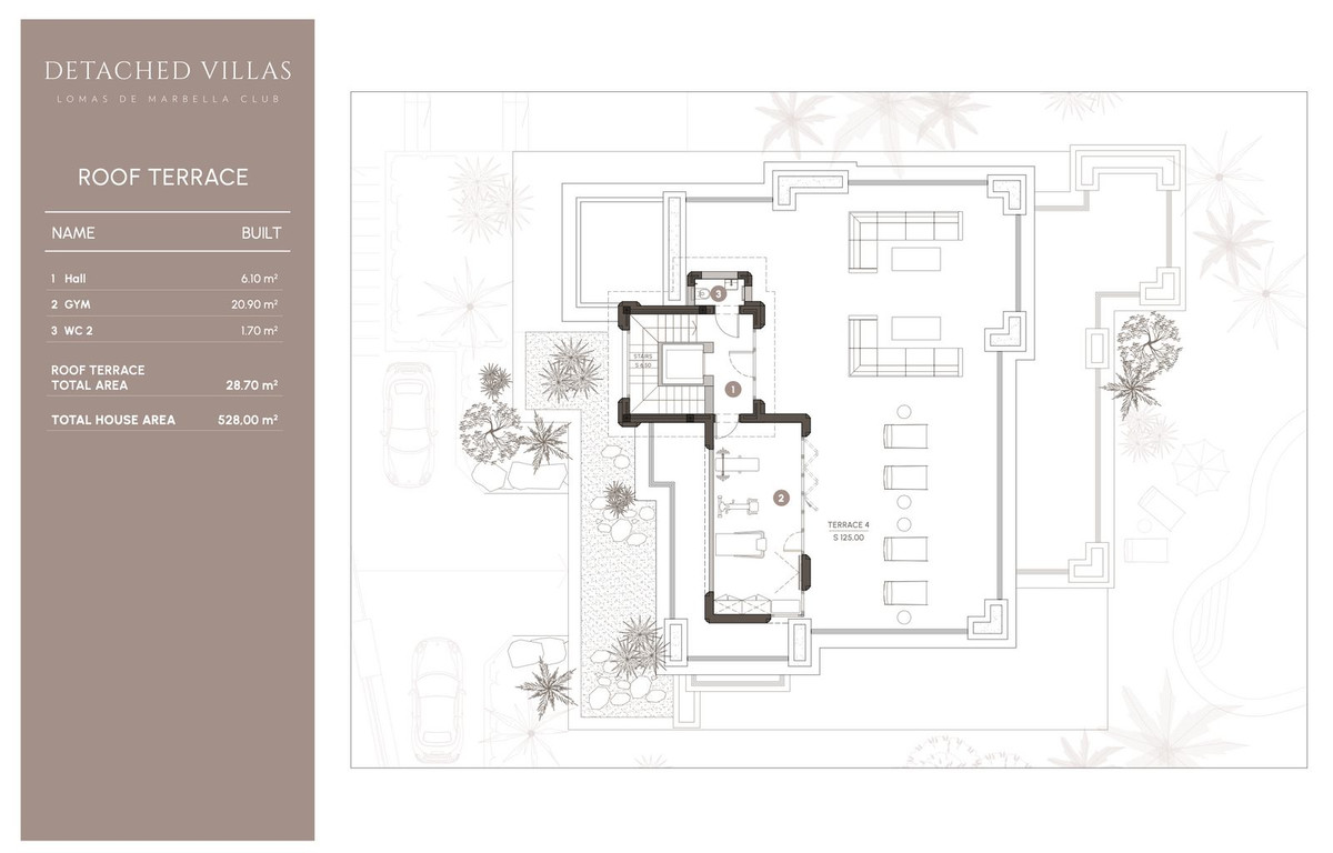 Chaque villa est harmonieusement répartie sur **trois niveaux**, avec une **terrasse sur le toit**, offrant une résidence de **six chambres** au design raffiné, avec de nombreux espaces de réception.