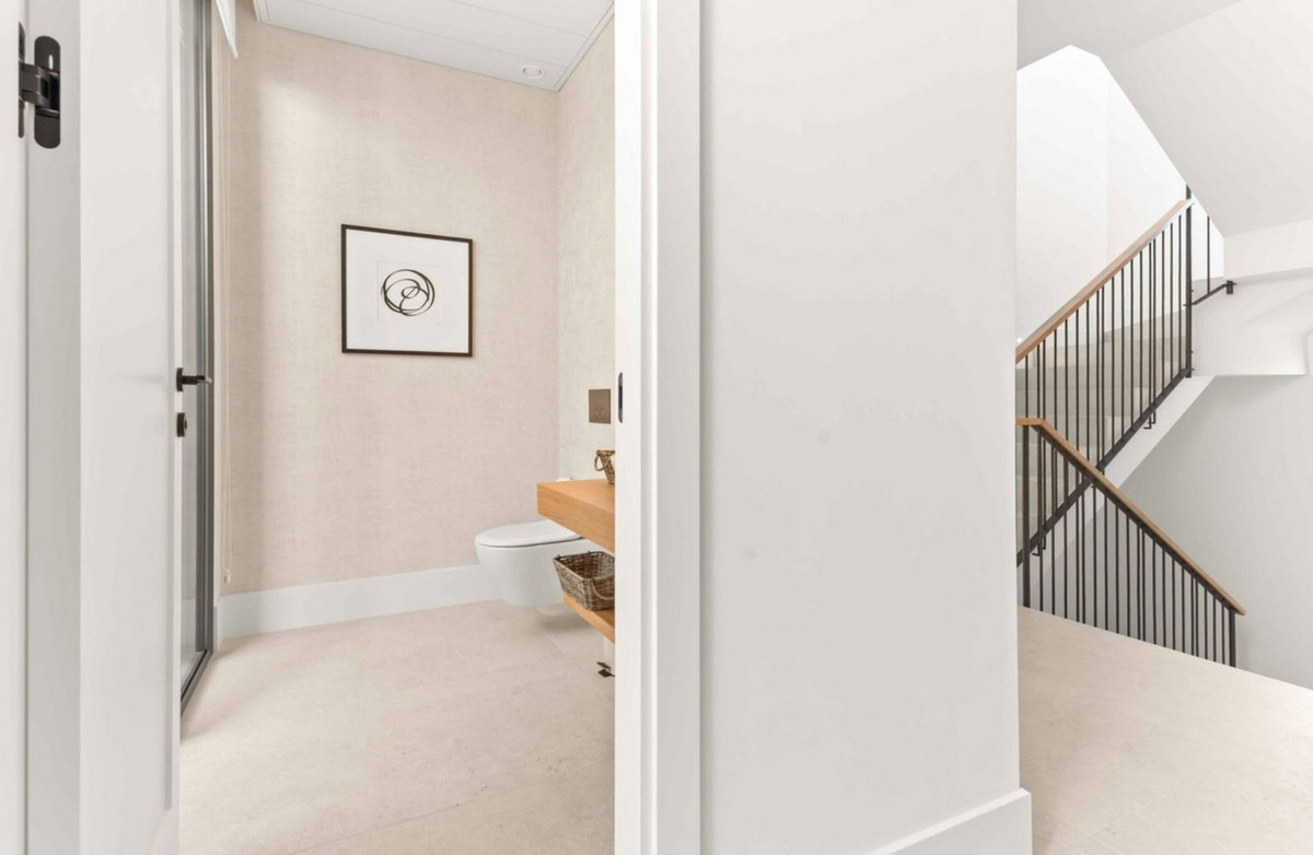 The kitchen features built-in appliances and a central island, offering both practicality and a welcoming space for entertaining. High-quality finishes and a cohesive design contribute to a calm and elegant atmosphere throughout the home.