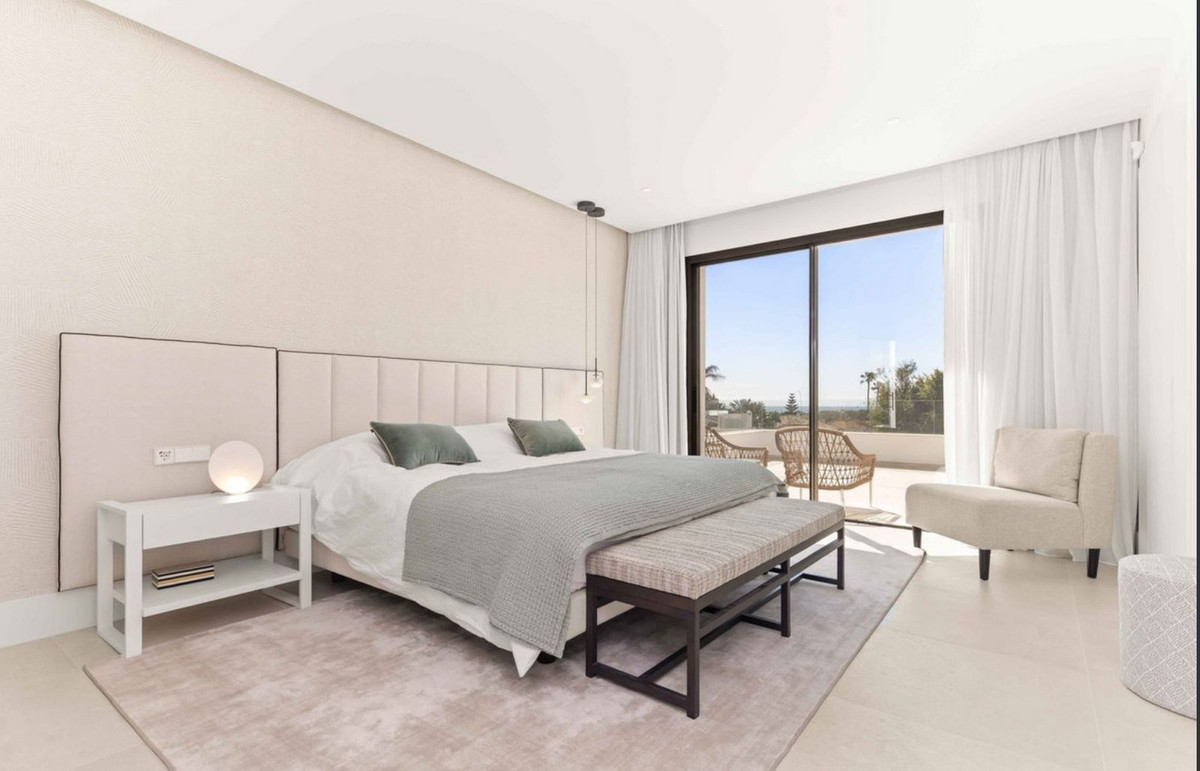 The villa offers five well-proportioned bedrooms with built-in storage, arranged to balance privacy and functionality. The main suite enjoys direct terrace access and includes its own en-suite bathroom, while the remaining bedrooms are thoughtfully positioned within the layout.