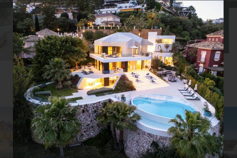 Designed by renowned architect Antonio Morillo of AMES Architects and fully renovated in 2020 by Palmeras, the property showcases sophisticated contemporary design. Distributed over three levels, the villa offers 555 m² of built space complemented by 530 m² of terraces, set on a generous 1,941 m² plot.