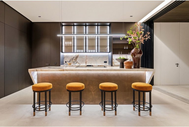 The lower level unfolds nearly 800 m² of elegant living space, designed to maximize natural light and views through large windows. This level includes multiple lounges for relaxation or entertaining, a games room, private cinema, fully equipped gym and an indoor spa with pool and jacuzzi.