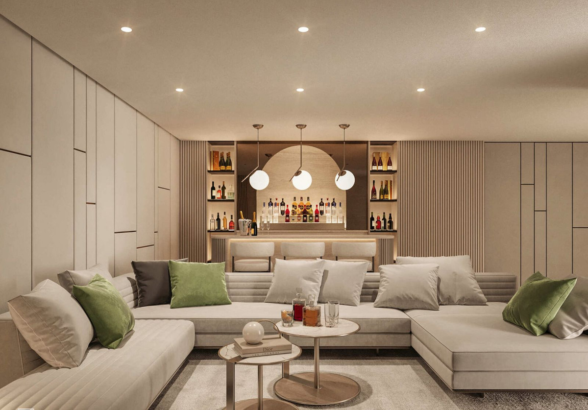 Inside, the sense of space continues effortlessly. The main living area unfolds as an elegant open-plan environment where the kitchen, dining, and lounge areas flow together beneath a sculpted ceiling. On the lower level, the residence comes alive with a refined entertainment lounge and bar, ideal for social gatherings or relaxed evenings. The option of a fully equipped private gym completes the wellness experience.