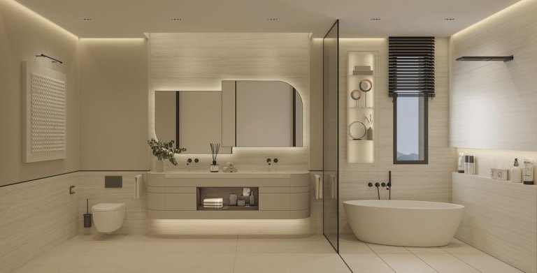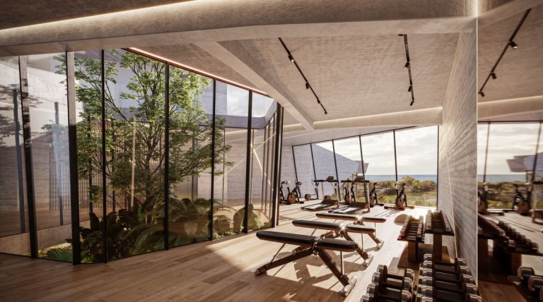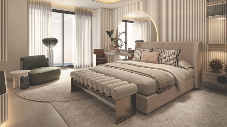 The villa welcomes you into an elegant open-plan living room. This open space enjoys floor-to-ceiling windows that allow plenty of natural light that blends to perfection. The living room, dining area and kitchen have all access to the expansive covered terrace and manicured garden. The dining area leads to an exquisite custom-made gourmet kitchen, finished to the highest qualities and with high-end appliances.