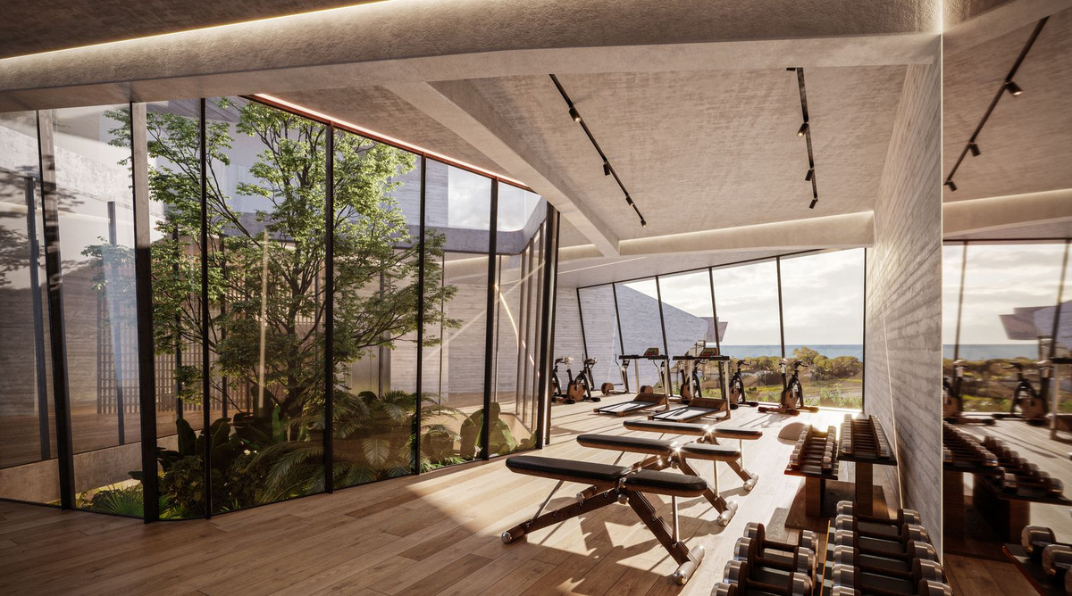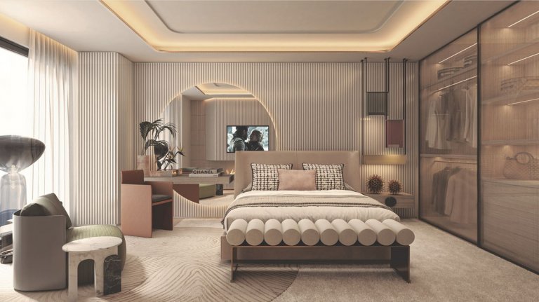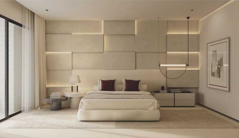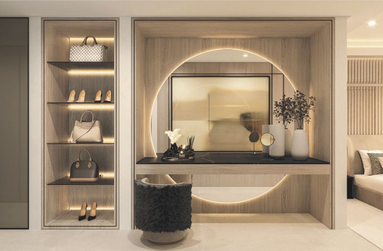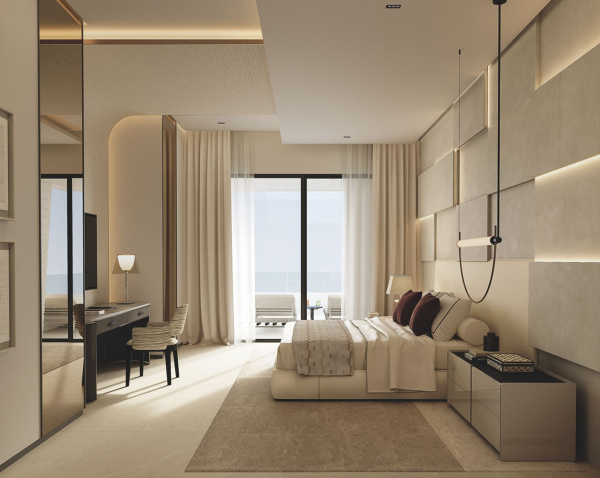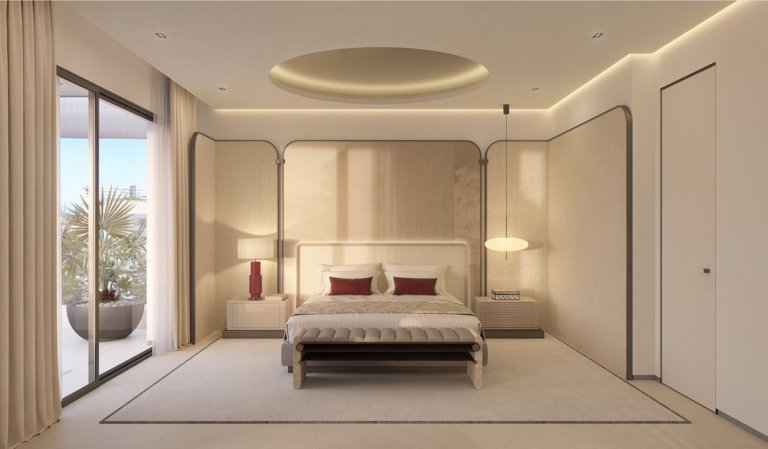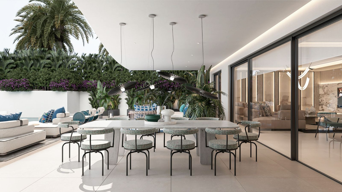 The villa welcomes you into an elegant open-plan living room. This open space enjoys floor-to-ceiling windows that allow plenty of natural light that blends to perfection. The living room, dining area and kitchen have all access to the expansive covered terrace and manicured garden. The dining area leads to an exquisite custom-made gourmet kitchen, finished to the highest qualities and with high-end appliances.