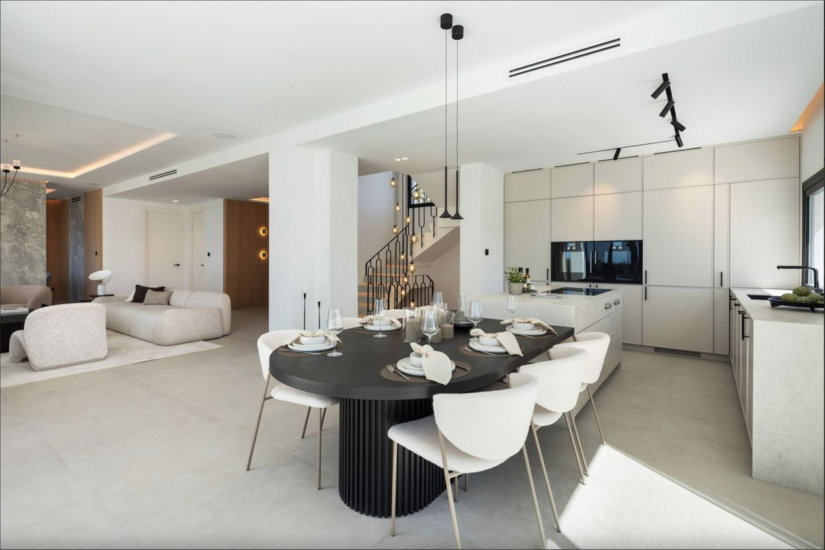 The upper floor is dedicated to a luxurious master suite, complete with a walk-in closet, a lavish bathroom, and access to a private terrace offering panoramic views. Two additional ensuite bedrooms on this level provide privacy and comfort, complemented by several terraces ideal for relaxation.