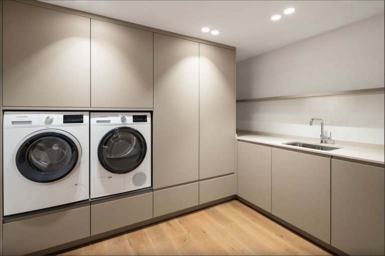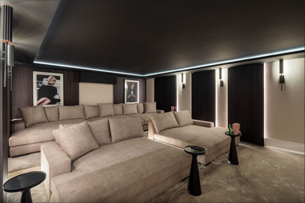 The open-plan ground floor is designed for contemporary living, featuring an elegant living area, a bespoke Danish kitchen equipped with premium Gaggenau and Siemens appliances, Dekton countertops, and sleek lacquered cabinetry. This space flows seamlessly into a refined dining area and a comfortable TV lounge.