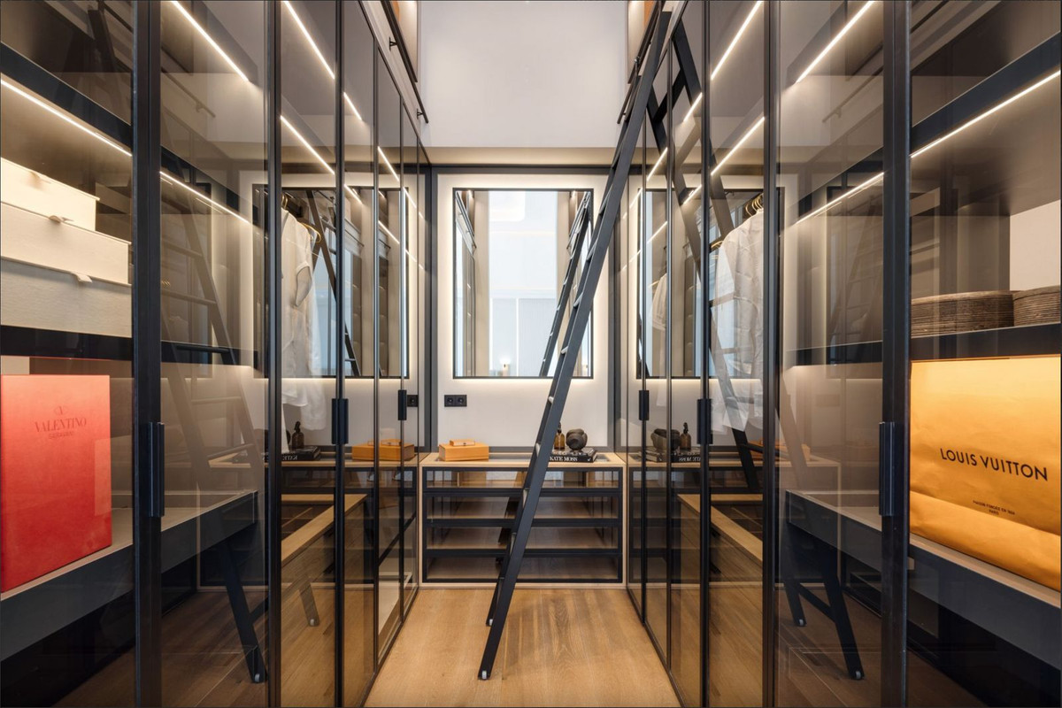 The lower level is designed for entertainment and leisure, featuring a stylish bar and lounge, a custom-made glass wine cellar, a private cinema room, and an impressive garage with a glass wall that showcases vehicles as part of the home's design.