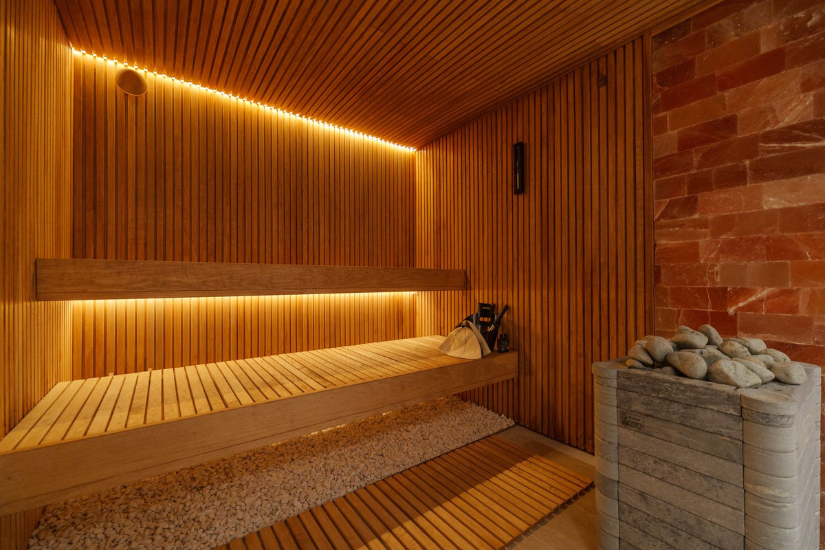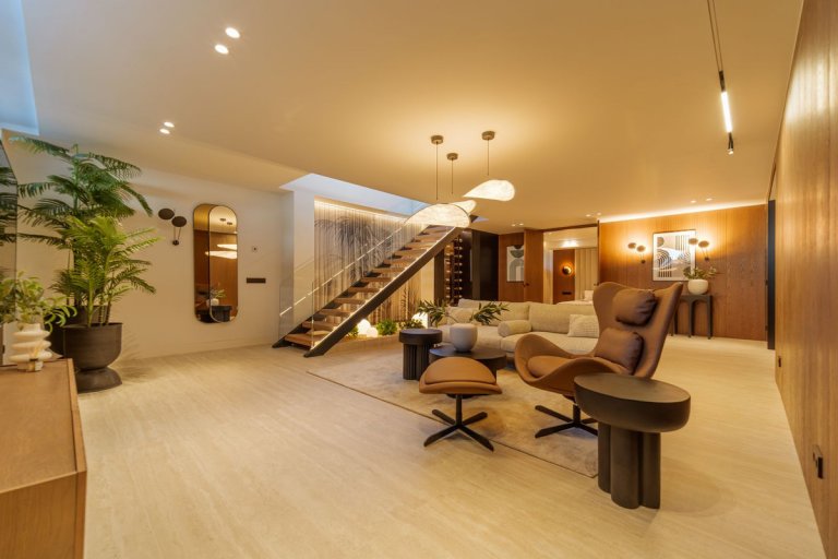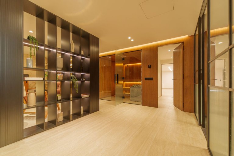 The lower level adds additional comfort with a guest bedroom, a home office, a fully fitted fitness room and a wellness area featuring a sauna.