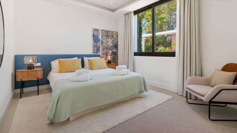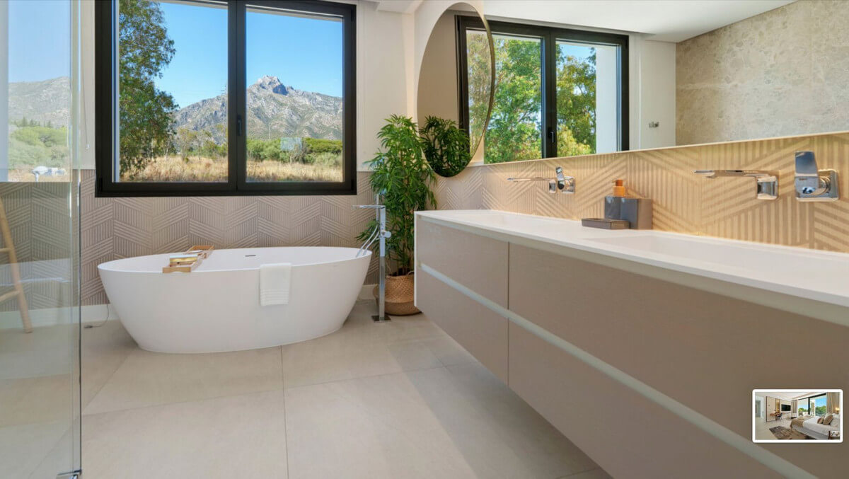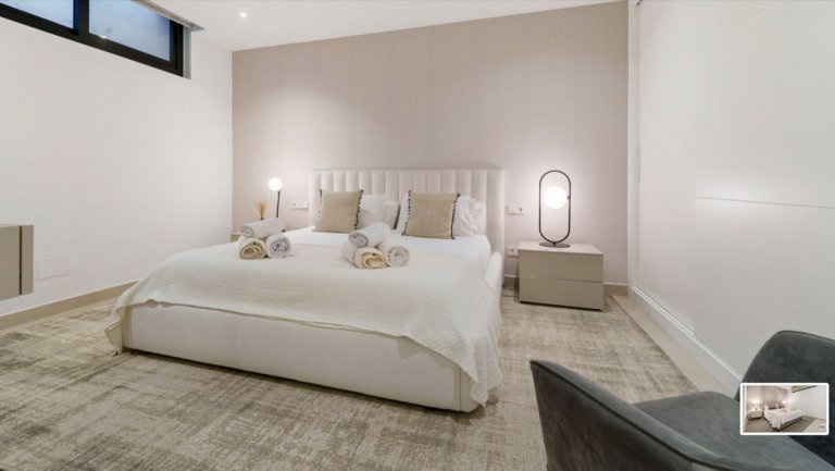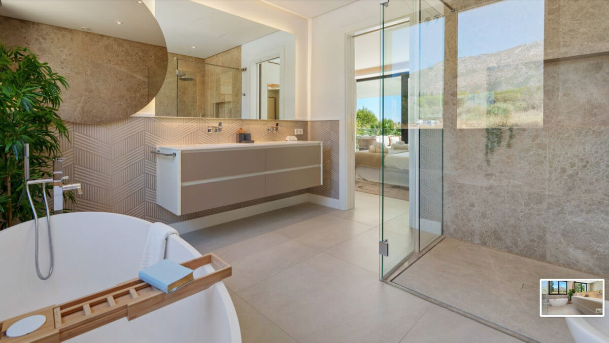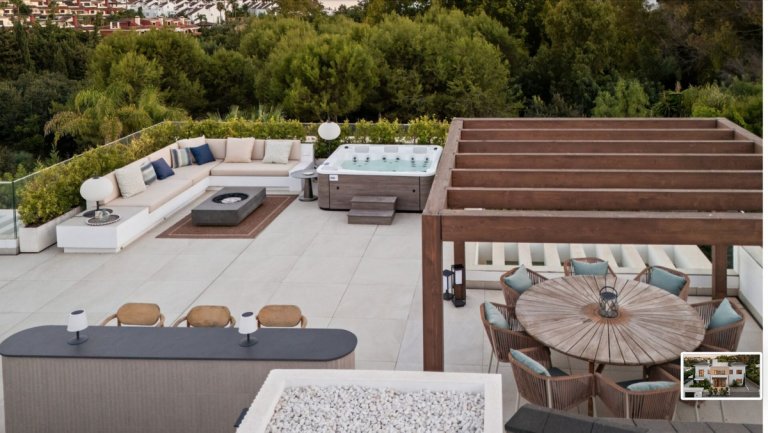 Each bedroom is conceived as a private sanctuary with its own en-suite bathroom. The master suite stands out with a spa-inspired bathroom, freestanding bathtub and stunning views of La Concha mountain. Outdoors, generous terraces, a rooftop lounge with Jacuzzi and a striking infinity pool provide exceptional spaces for relaxation and social gatherings.